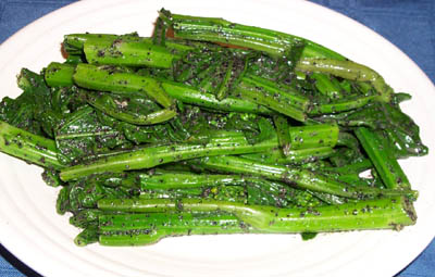 aemonoThis particular dish uses a Chinese vegetable called yu tsai, but many leafy green vegetables such as spinach can be blanched, dressed with vinegar, a little sugar, and, in this case, ground black sesame seeds. I call this dish yu tsai ae. |